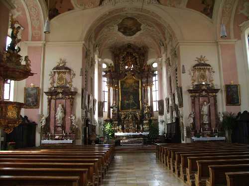Die Tafel an der Kirche verrät uns, dass die Kirche 1729 - 31 an Stelle eines Vorgängerbaus nach Plänen von Franz Joseph Roth erbaut, im Krieg stark zerstört, nach 1945 wieder aufgebaut wurde.